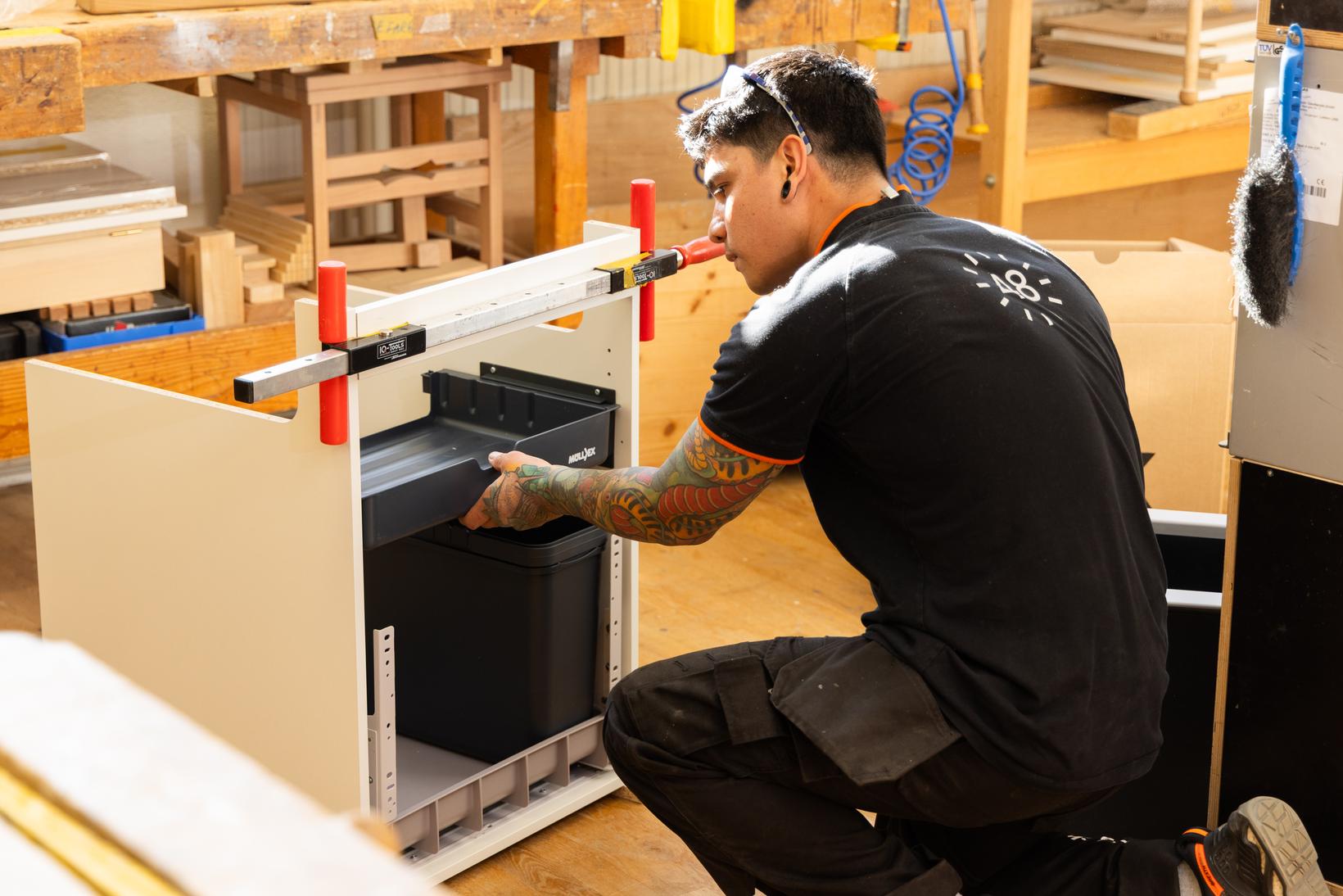 Schreiner48 besprach sich mit der Berufsschule, denn intern war klar: Dieser Mensch passt zum Unternehmen. Er hat Leidenschaft für das Schreinern und bringt die richtigen sozialen Skills fürs Team mit. Deshalb ermöglicht Schreiner48 ihm eine einmalige Ausnahme: eine Zweitausbildung in der Schreiner48 Academy.