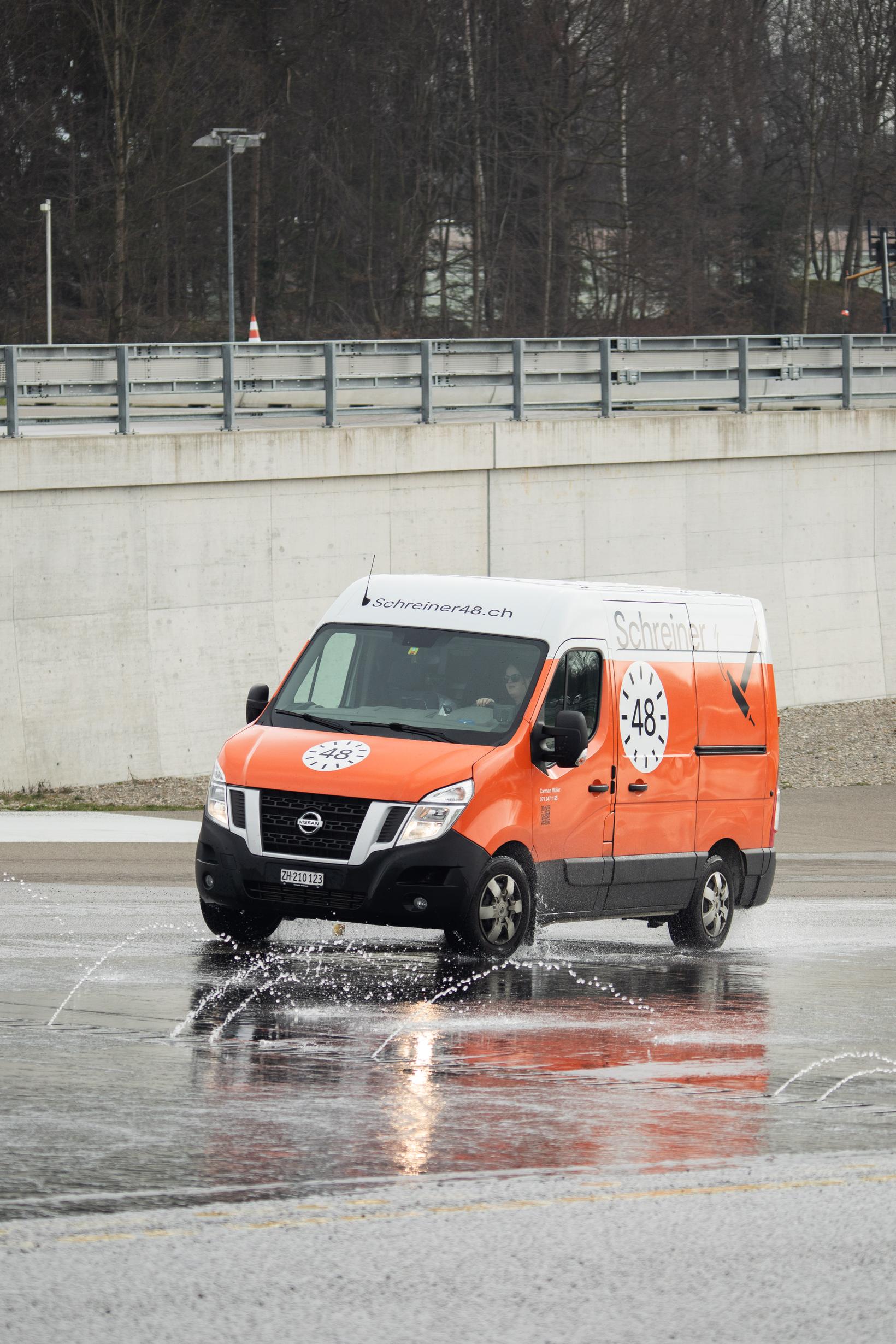 Dass alle Fahrkünste nicht helfen, wenn der Bus stümperhaft beladen ist, zeigten spektakuläre Aufprall-Videos im Theorieblock, der ein Experte von Sortimo vermittelte. Als Best-Practice-Beispiel hingegen kürte der Fachmann die ausgebauten Busse unserer 48er. «Er inspizierte die Fahrzeuge aller Teilnehmenden und war richtig beeindruckt vom Ausbau der Schreiner48-Büssli », meint Samuel stolz. «Kein Wunder, unser Schubladen- und Befestigungssystem haben wir auch wirklich bis ins letzte Detail optimiert.» Mit zwei Zertifikaten und einem neuen Gefühl für ihre Fahrzeuge verliessen unsere Kundenschreiner:innen das Testgelände – bereit für den nächsten Einsatz bei Sturm oder Eisglätte.