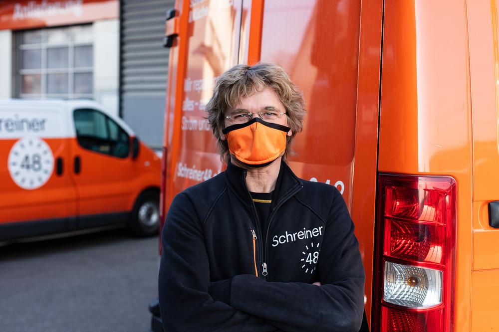 Damit die Arbeiten und auch Ausbildungsprojekte weitergehen, gelten zusätzliche Sicherheitsmassnahmen in der Academy: Wann immer möglich, wird mit zwei Metern Abstand gearbeitet – und neu natürlich mit Mundschutz. Anfangs noch mit dem Standard-Mundschutz aber Schreiner48 hat blitzschnell reagiert: Neu gibt es massgeschneiderte, waschbare, dreilagige Baumwollmasken – natürlich in den Farben Orange und Schwarz.